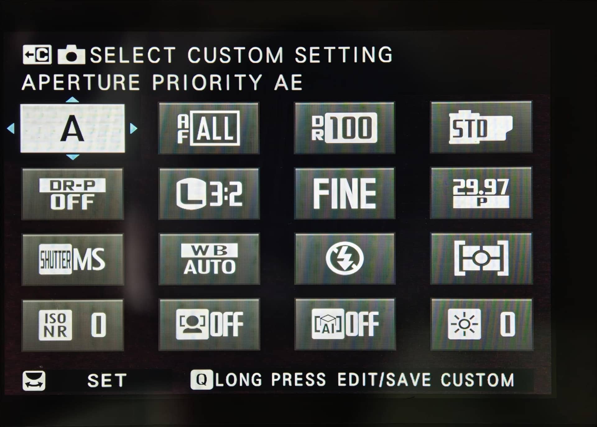 จะพบว่าระบบเลือกช่องซ้ายบนสุดเอาไว้ให้เสมอ ตามภาพนี้แสดงตัว A เอาไว้เพื่อบอกว่ากำลังใช้การถ่ายภาพแบบ Aperture Priority AE จากนั้นให้หมุนปุ่มด้านหลังของกล้องไปเรื่อยๆจะสามารถเลือกใช้ Custom ที่ต้องการได้สะดวกมาก