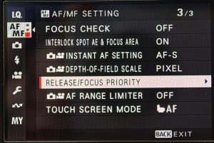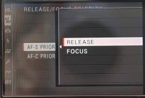 ตามปกติกล้องจะถูกตั้งค่าไว้ให้เราสามารถกดชัตเตอร์เพื่อถ่ายภาพได้เสมอทั้งที่ภาพนั้นยังไม่ได้ถูกโฟกัส โดยตั้งค่าไว้แบบ Release ตามภาพ แต่ถ้าต้องการให้มั่นใจว่าได้จัดโฟกัสไว้เรียบร้อยแล้วให้เปลี่ยนระบบเป็น Focus (แนะนำให้เปลี่ยนทั้ง AF-S และ AF-C เป็น Focus Priority)
